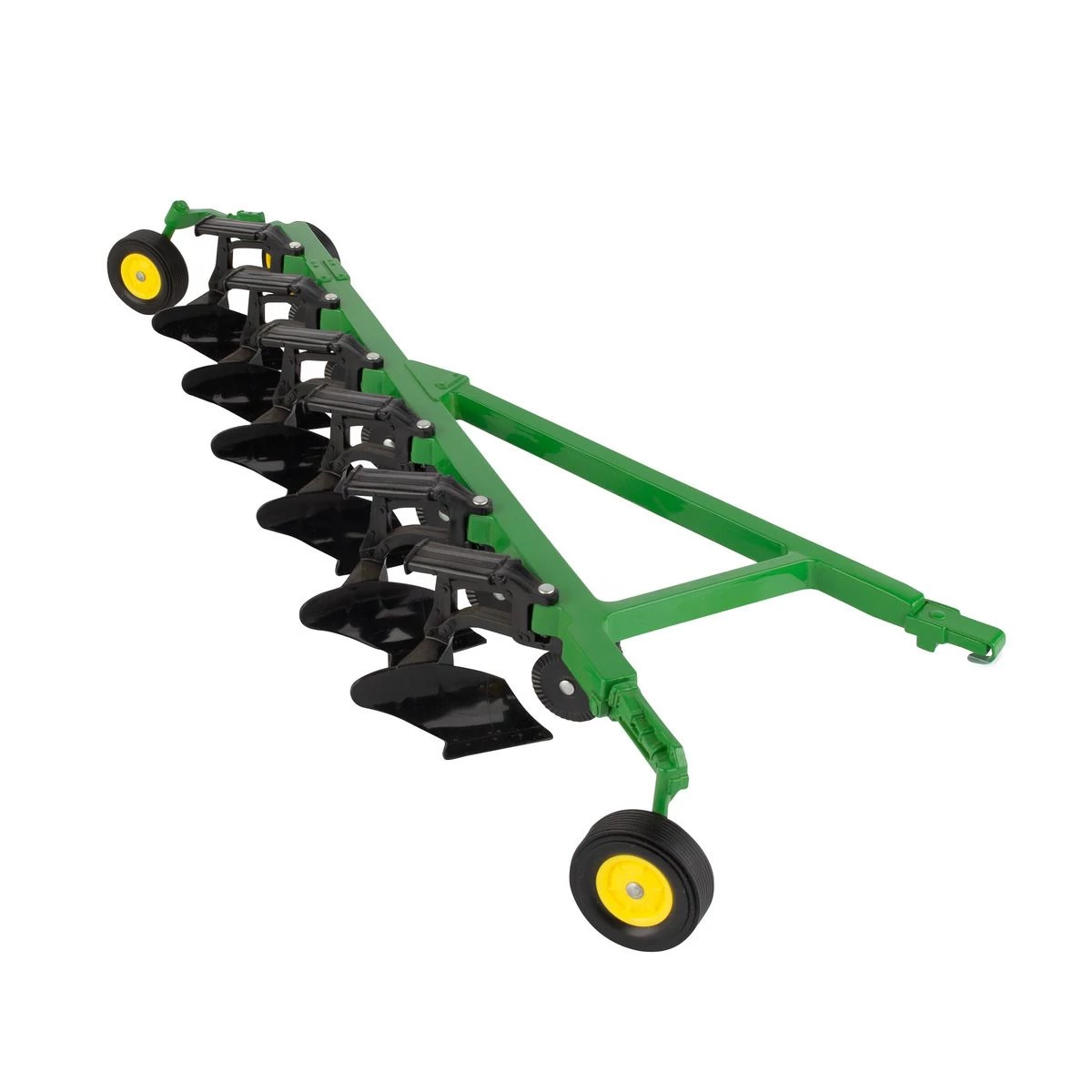 The 1:16 John Deere 3600 six bottom plow features a die cast frame as well as front and rear tire wheel supports. Engineering grade free rolling disk blade ground openers. Plastic plow share turn the dirt over. Soft feel tires are mounted on plastic wheels. Age 3+