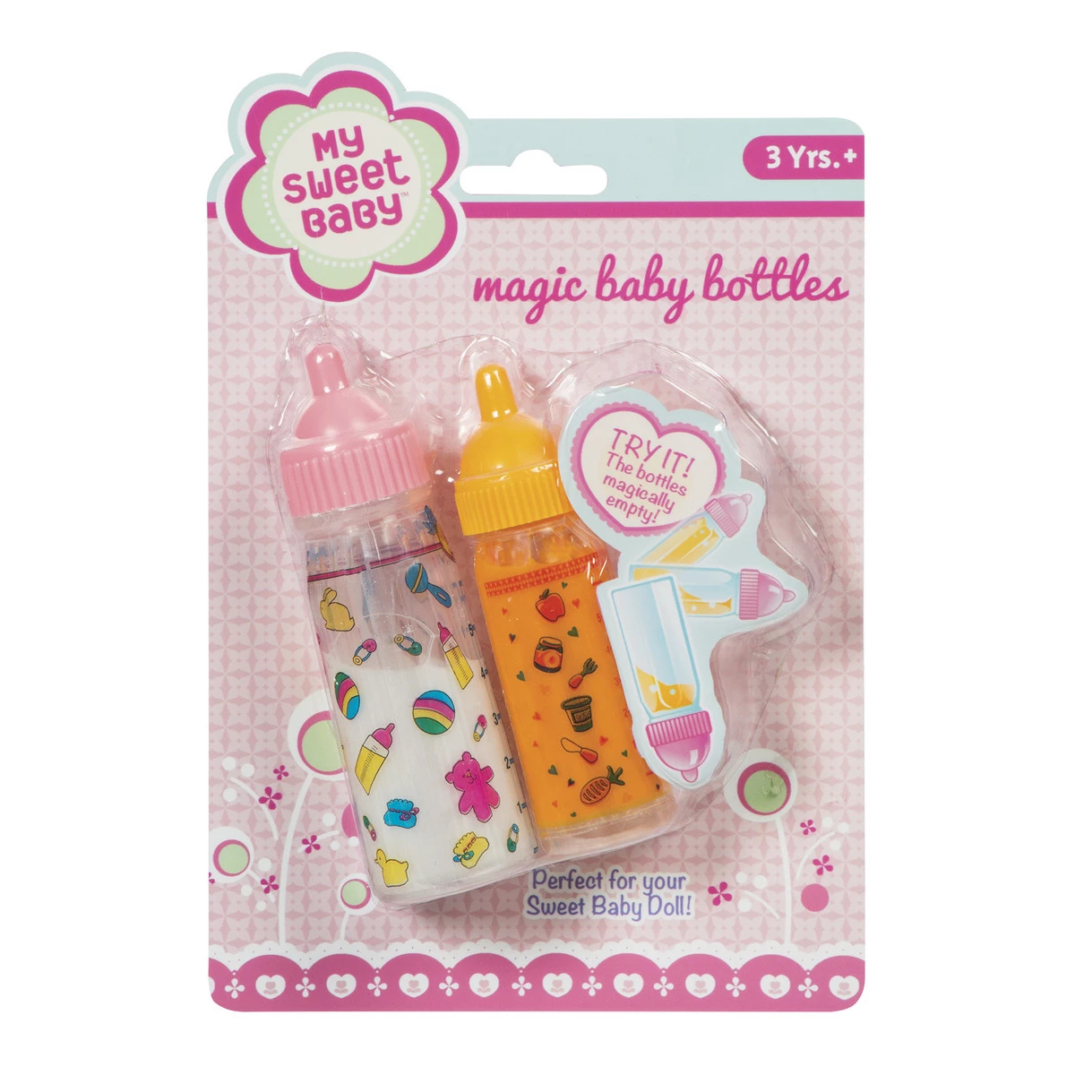 The milk bottle measures 4 3/4″ and the juice bottle is 4″ tall. 3yr+