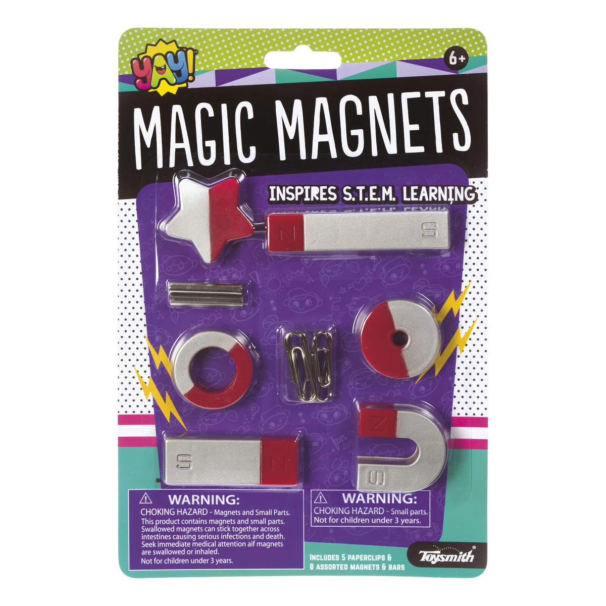 Inspires STEM learning. Includes 5 paperclips, 8 assorted magnets & bars.