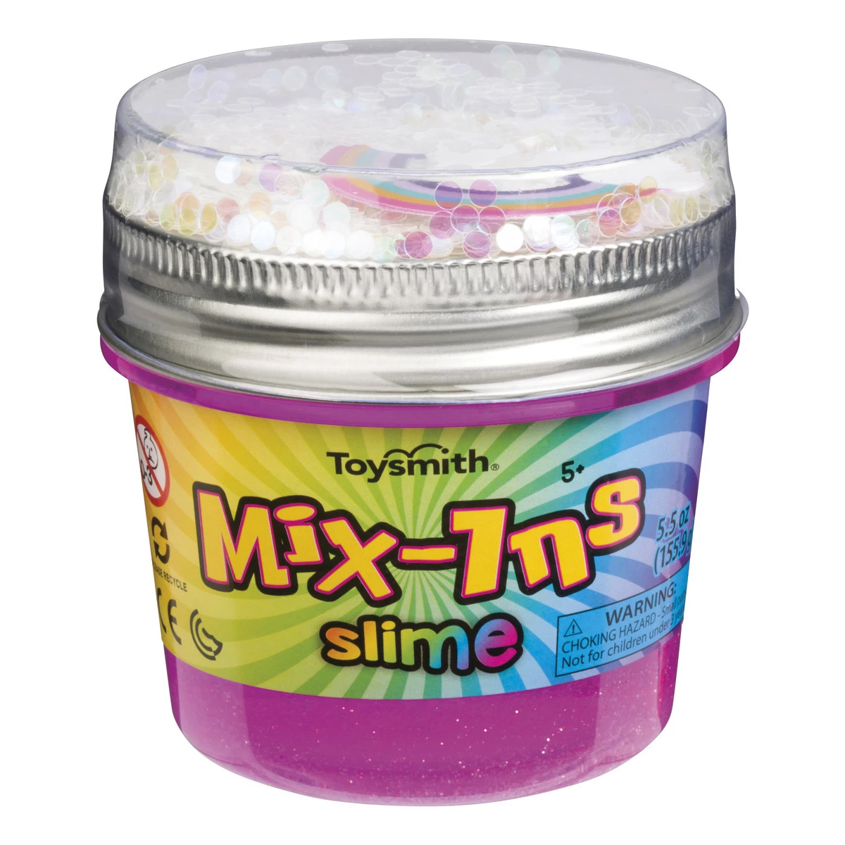 Add shine to clear slime with confetti. Jar measures 3″ x 2 3/4″ 5.5 oz. Assorted colors. 5yr+